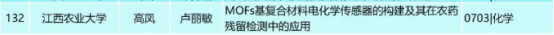 近日,江西省人民政府学位委员会办公室发布了《关于2023年江西省优秀博士硕士学位论文评审结果的公示》,公司2020级化学专业硕士研究生高凤(导师:卢丽敏)的学位论文《MOFs基复合材料电化学传感器的构建及其在农药残留检测中的应用》获评2023年江西省优秀硕士学位论文。