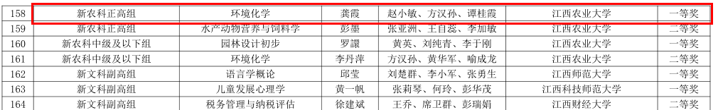 近日,江西省第五届高校教师教学创新大赛结果揭晓,公司龚霞教授“环境化学”教学团队荣获新农科正高组一等奖。