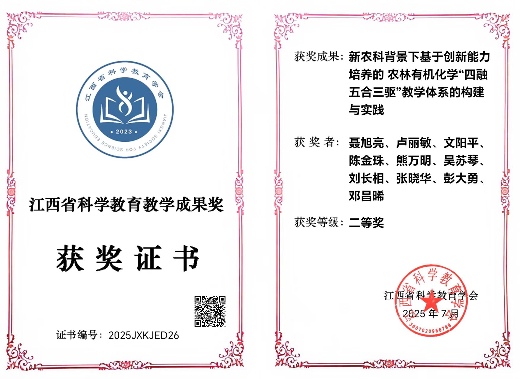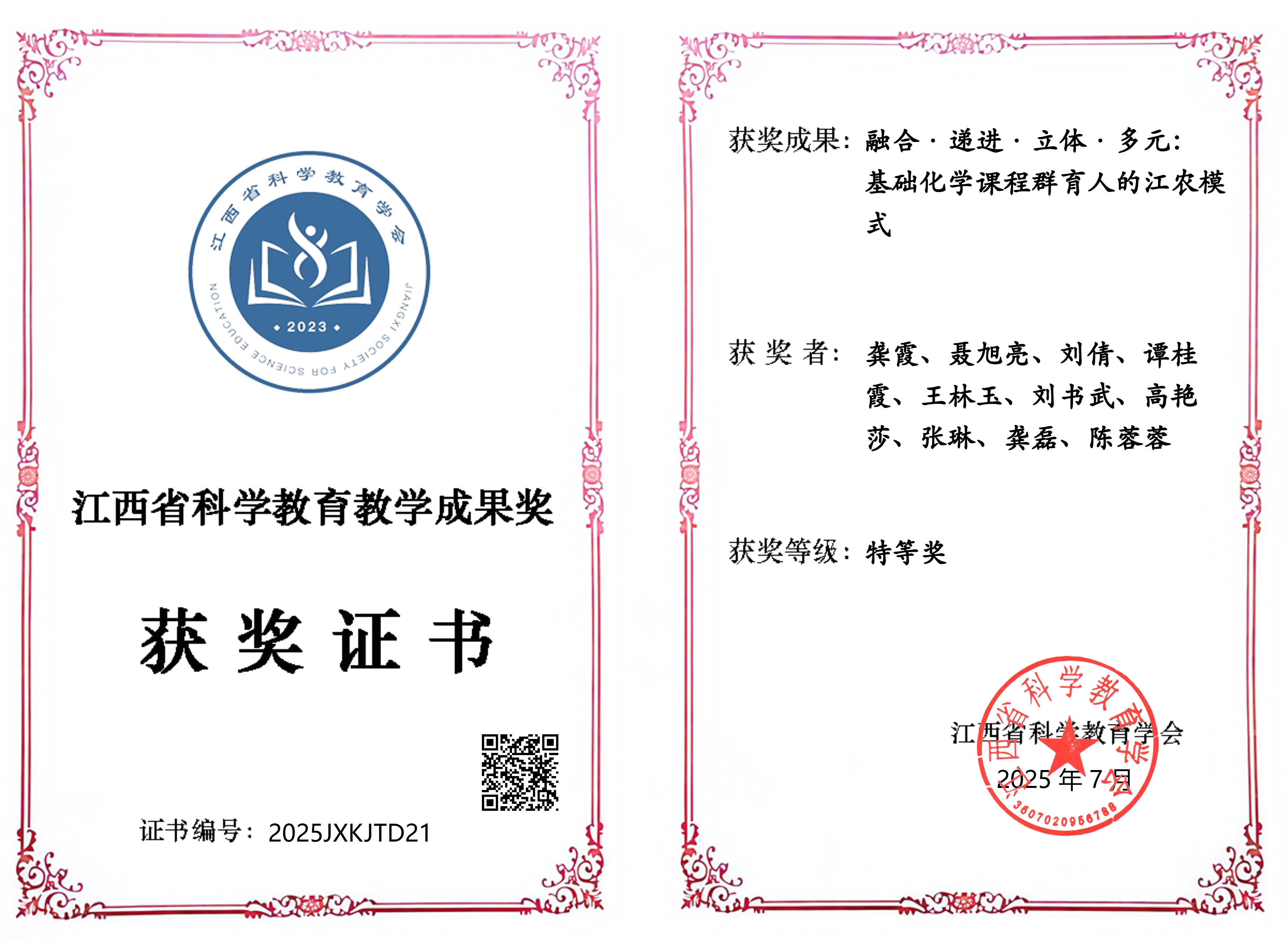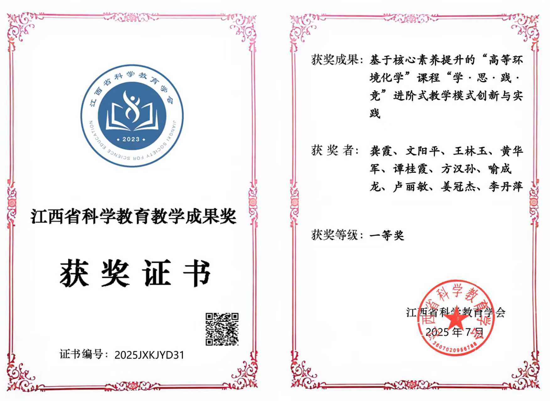 另外,公司3项教学成果获得江西省科学教育学会教学成果奖。其中,龚霞、聂旭亮、刘倩等的教学成果“融合·递进·立体·多元:基础化学课程群育人的江农模式”荣获特等奖,龚霞、文阳平、王林玉等的教学成果“基于核心素养提升的‘高等环境化学’课程‘学·思·践·竞’进阶式教学模式创新与实践”荣获一等奖,聂旭亮、卢丽敏、文阳平等的教学成果“新农科背景下基于创新能力培养的农林有机化学‘四融五合三驱’教学体系的构建与实践”荣获二等奖。