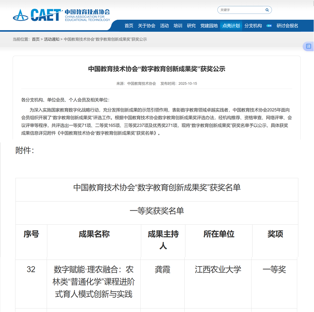 近日,中国教育技术协会公布了2025年数字教育创新成果奖获奖名单,龚霞、王林玉、谭桂霞、吴东平、吴国平和张高亮完成的教学成果“数字赋能·理农融合:农林类‘普通化学’课程进阶式育人模式创新与实践”获得一等奖。