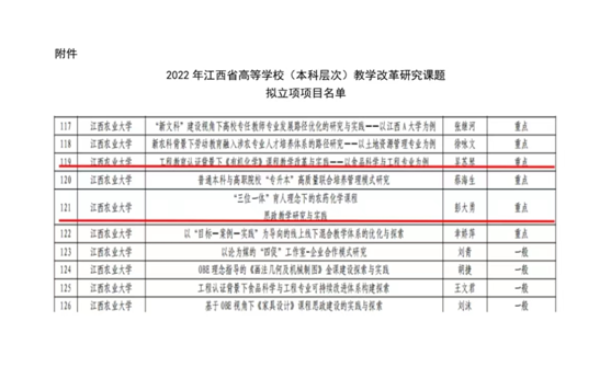 202212月初,江西省教育厅公布了2022年江西省高等公司公司产品改革研究重点项目课题(本科层次)评审结果,pa娱乐游戏官网共获批立项课题26项,其中,重点项目6项。其中,公司吴苏琴老师申报的“工程教育认证背景下《有机化学》课程教学改革与实践——以食品科学与工程专业为例”和彭大勇老师申报的“‘三位一体’育人理念下的农药化学课程思政教学研究与实践”均获得重点项目立项。