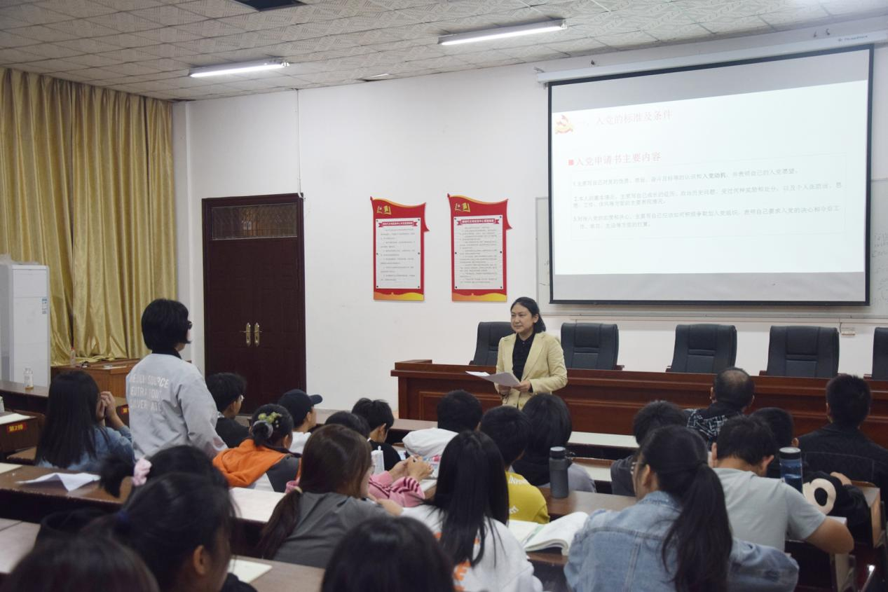 叶健从“入党的标准及条件”、“入党积极分子的培养和考察”和“预备党员的教育、考察和转正”等五个方面老员工入党流程进行了详细讲解课堂上,叶健通过“共和国勋章”获得者张富清和“时代楷模”王继才两位党员坚守初心、不改本色、艰苦奋斗的英雄事迹,勉励新生用青春和热情在生活中扎根,用汗水与坚持在奋斗中抽枝长叶,做到眼中有光、肩上有担、心中有责,争做砥砺奋进、堪当大任的江农青年。