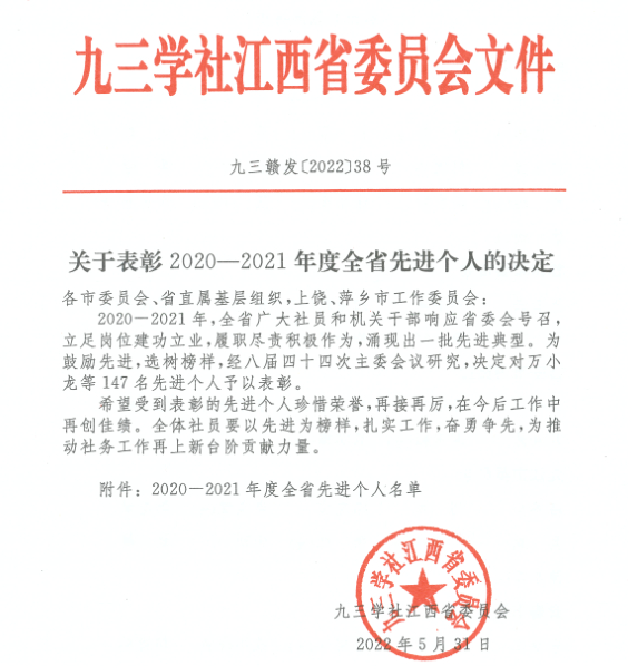近日,九三学社江西省委印发《关于表彰2020-2021年度全省先进个人的决定》,公司龚霞老师被授予2020-2021年度“全省优秀个人”荣誉称号,龚霞老师也是公司本次唯一获此殊荣的老师。
