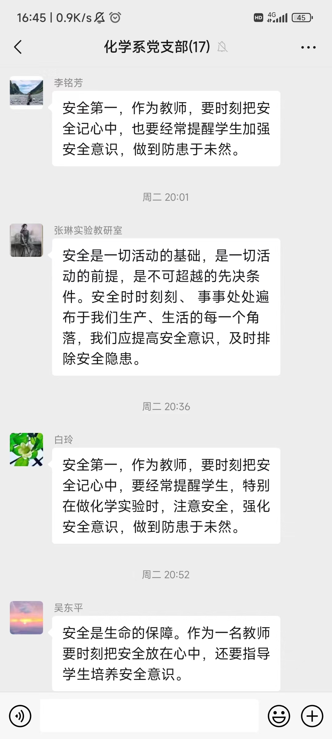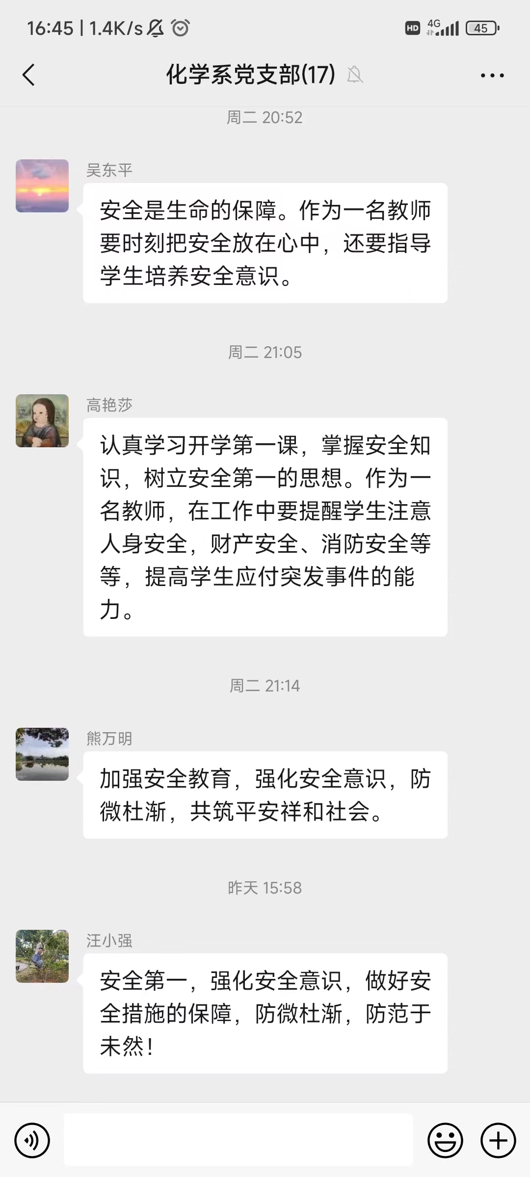2024年2月27日,为落实公司关于开展2024年春季“开学第一课”暨安全教育周活动的通知的精神,化学系党支部以“安全教育”为主题开展主题党日活动,各党员同志认真学习贯彻文件要求,同时在微信热烈交流讨论,分享自己的学习体会。通过本次党日活动,提高了安全防范意识、增强了自我防护能力。