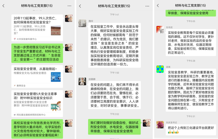 随着公司教学科研综合实力的逐步提升,无论从实验室数量上还是科研硬件上都有很大的发展。为了更好的使实验室为教学和科研服务,保障实验室安全,材料与化工支部党员于6月30日共同研讨了实验室安全管理问题,明确了实验室安全管理责任人的具体职责,部分党员实验室的安全责任人签署了“化学与材料公司实验室安全管理责任书”,积极为公司实验室的安全管理贡献自己的力量。7月1日,通过线上方式,支部书记刘倩结合高校实验室的特殊性展示了实验室安全管理面对的严峻形势,强调实验室安全管理的重要性和必要性,进一步确立了“生命至上、安全第一”的安全文化建设理念。支部党员均表示要提高认识、多做预防、把实验室安全工作做好做实。