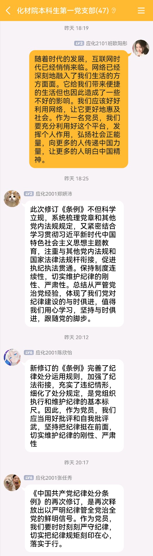 2024年3月30日至31日,本科生第一党支部通过线上方式开展3月份主题党日,组织支部党员认真学习《中国共产党纪律处分条例》新修订细则。