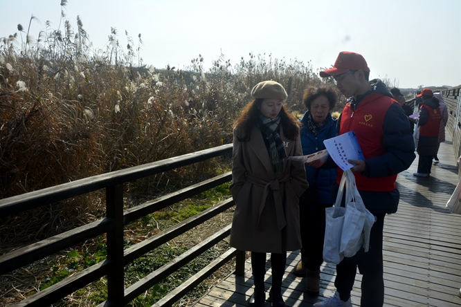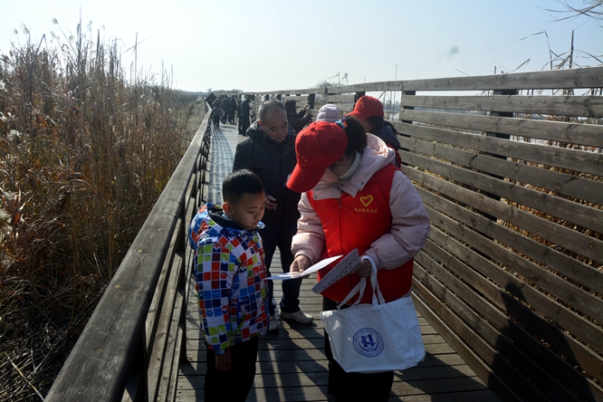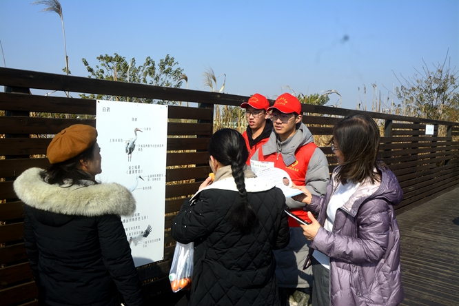 志愿服务队一行前往白鹤小镇中的千亩藕塘,近距离观看数千只白鹤在藕塘里嬉戏觅食的场景,并对藕塘水土提取采样。在游客观鸟步道上,协会成员向熙熙攘攘的游客们散发候鸟保护传单,宣讲候鸟科普知识,得到了游客们的肯定与赞赏。