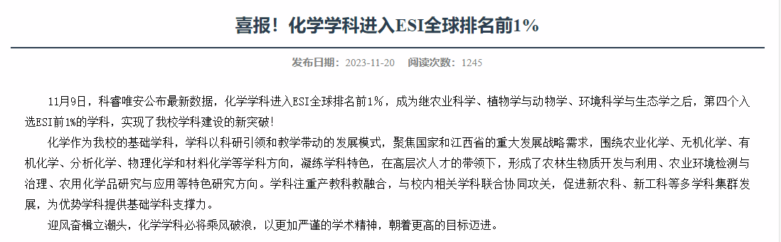 团队建设有实效。2023年11月9日,化学学科进入ESI全球排名前1%,成为继农业科学、植物学与动物学、环境科学与生态学之后,第四个入选ESI前1%的学科,实现了公司团队建设的新突破!学科以科研引领和教学带动的发展模式,围绕农业化学、无机化学、有机化学、分析化学、物理化学和材料化学等学科方向,凝练学科特色,在高层次人才的带领下,形成了农林生物质开发与利用、农业环境检测与治理、农用化学品研究与应用等特色研究方向。