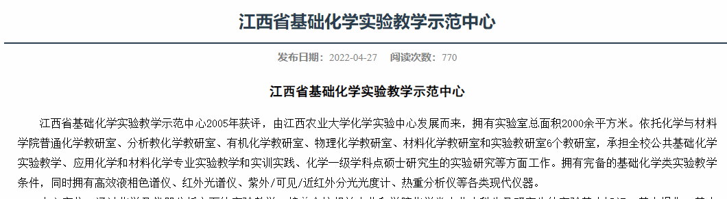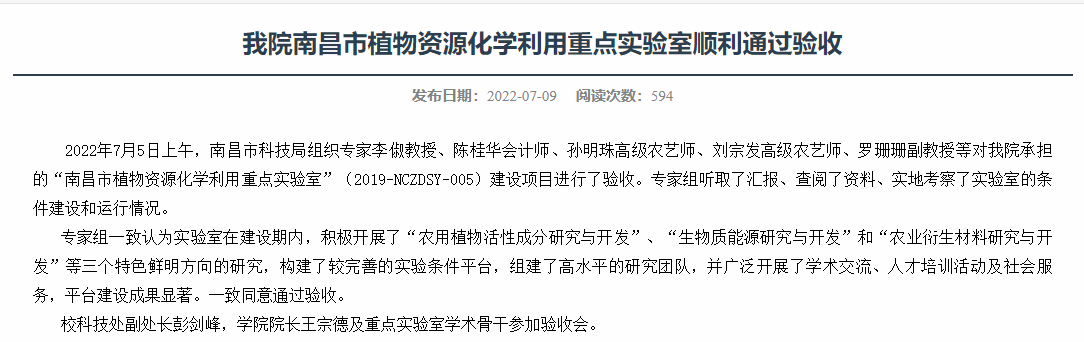 平台建设有实效。基于教学研究型公司定位,公司围绕“建平台、组团队、育成果”的工作思路,于2019年获批南昌市重点实验室1个,实现市级重点实验室零的突破。目前,公司已拥有江西省基础化学实验教学示范中心、南昌市植物资源化学利用重点实验室、南昌市有机功能材料与农业应用优势科技创新团队、pa娱乐游戏官网功能材料与农业应用化学研究所、5个校外研究生联合培养基地等研究机构,为师生提供了良好的科研平台。