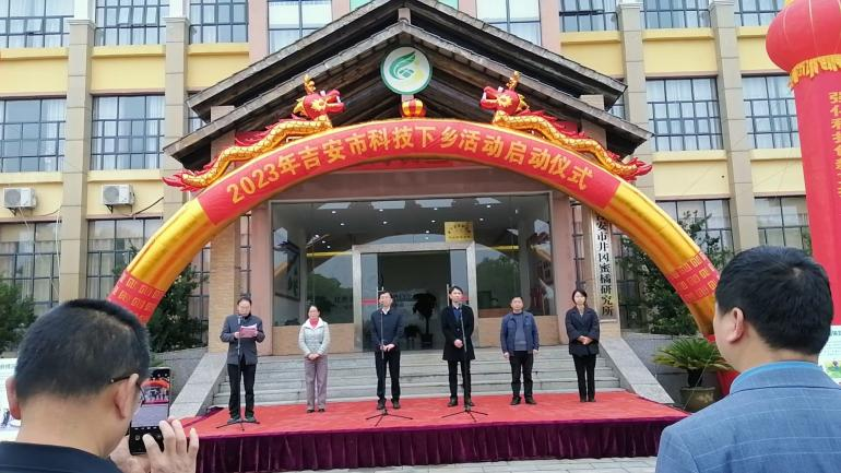2023 年3月30日,吉安市科技局在新干召开2023 年度吉安市科技下乡活动启动会,新干县人民政府副县长杨成奎同志致辞,省农业科公司蔬菜花卉研究所周劲松、江西腊月红生态果业有限公司负责人聂雄辉分别做了典型发言,市科技局副局长周俊才同志宣布活动启动,参加此次活动的科技人员和农户有200余人,启动会后公司黄喜根教授、彭大勇和黄建平博士分别到基地调研和指导。
