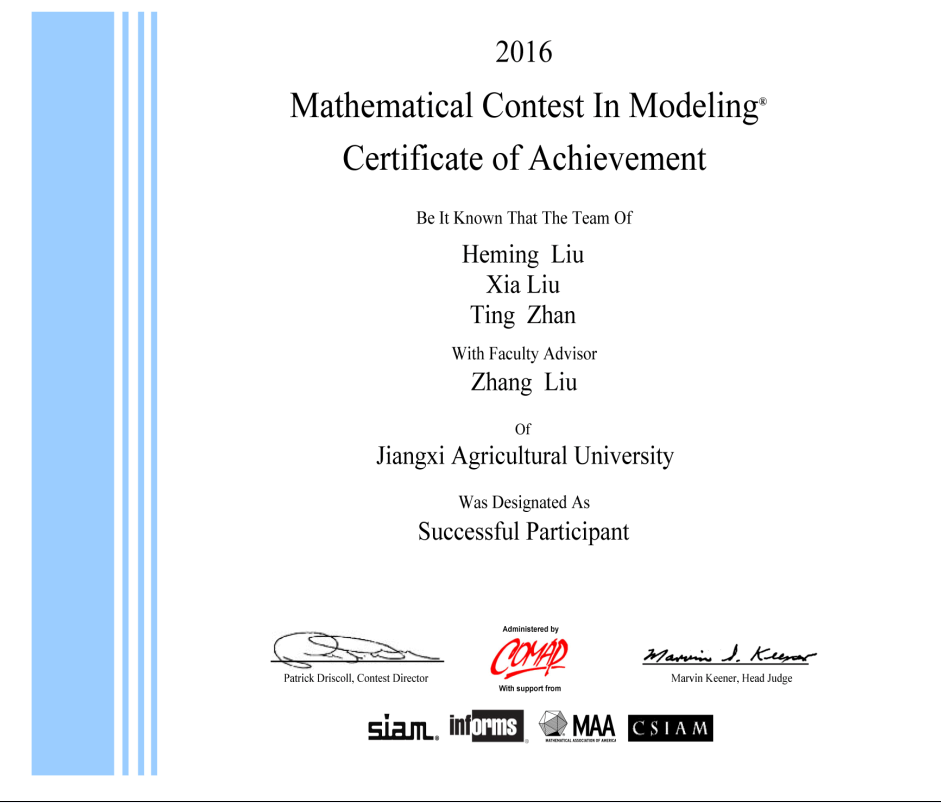 公司2015年开始,由理公司刘章老师指导一支队伍参赛,获得Successful Participant(三等奖)。(学工办)