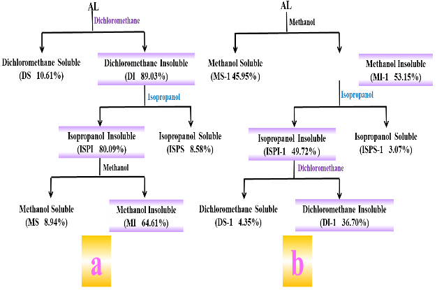 鉴于此,本论文通过采用逐步增大和降低甲醇、异丙醇和二氯甲烷这三种溶剂的汉森溶解度常数(HSP值)的策略进行次序提取碱木质素。该工作不仅揭示了提取次序在分级分离中所扮演的角色,而且为裁剪木质素大分子以获得具有可预测性质或潜在多功能性的材料提供了可能,有助于实现木质素的分级利用。