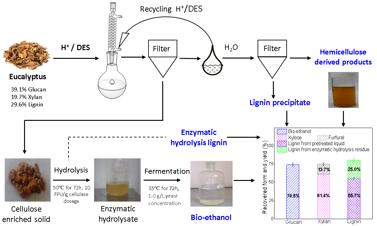 有鉴于此,本工作开发了一种先通过氯化胆碱-甲酸(ChCl-FA)预处理桉木,随后经酶解和发酵联产生物乙醇、木糖和木质素的方法。ChCl-FA预处理可以同时降解桉木中的木聚糖(~95.2%)和木质素(~74.4%)。酶解实验表明,100 g桉木的最高葡萄糖产量为35.3 g,相当于桉木中葡聚糖的90.3%。同时,酶解液经发酵后获得乙醇产量为16.5 g/100 g,相当于理论乙醇产量的74.5%。此外,预处理液和水解残渣中还可获得12.1 g木糖和23.9 g木质素,分别占桉木中61.4%的木聚糖和80.7%的木质素。总之,本研究开发的ChCl-FA预处理技术可以高效选择性地去除木质素和半纤维素,从而显著提高桉木的酶解和后续发酵,以便分级利用桉木成分。