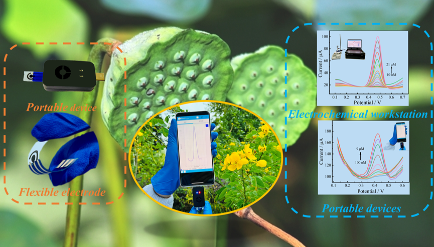 该工作采用水热法将MoS2前驱体用于制备莲蓬壳生物炭复合材料,再作为先进功能碳材料应用于电极改性材料。这工作不仅有效解决过度废弃堆积的莲蓬壳造成的环境负担,而且建立了废弃莲蓬壳生物质综合利用方法和丰富了电极改性材料新来源。随后开发了一种U盘形状的便携智能手机传感器用于金丝桃苷电化学检测,对比传统电化学传感器和高效液相色谱方法在实际样品检测中的应用,获得令人满意效果。